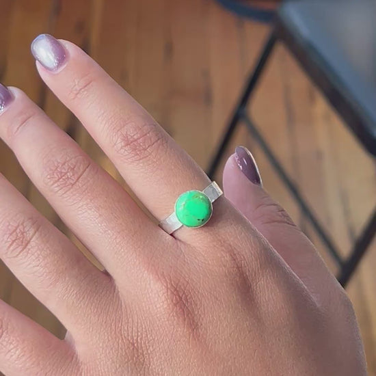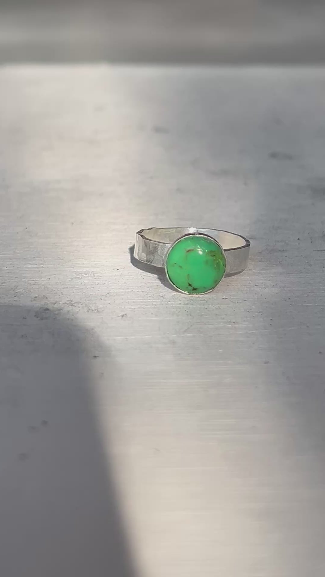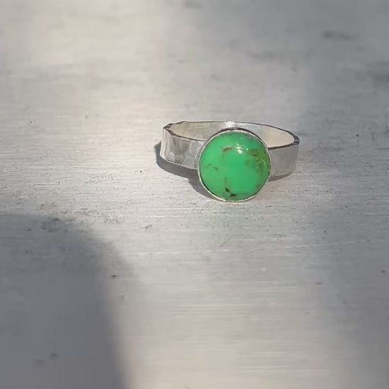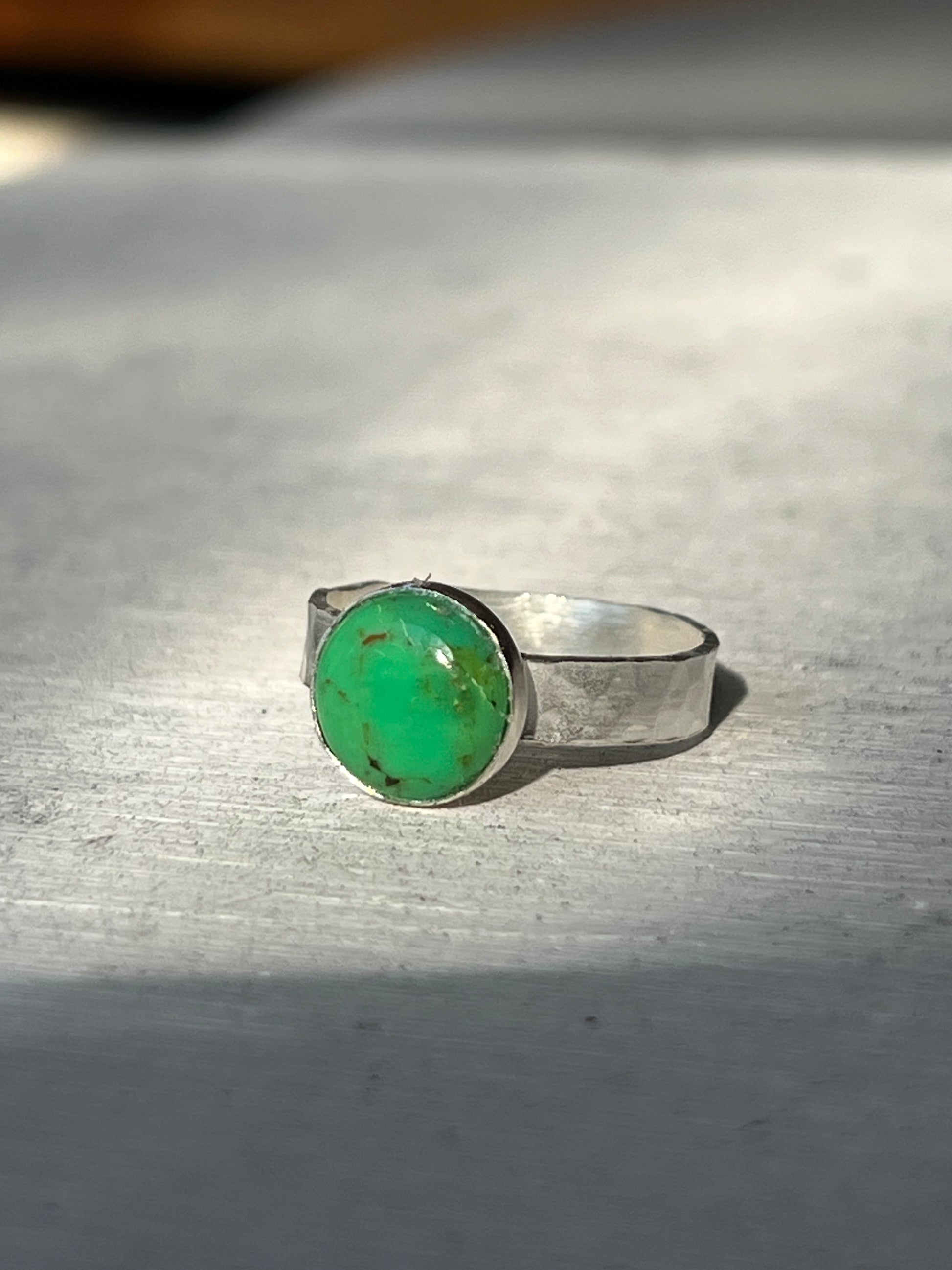 This stunning ring features a vibrant 10mm green turquoise stone set in a thick, hammered sterling silver band that for boho elegance. Handcrafted with care in our Sausalito studio, it offers a unique personal touch, choose to have an initial, heart, infinity, or astrological sign stamped inside the band. Perfect for expressing individuality while enjoying timeless style.