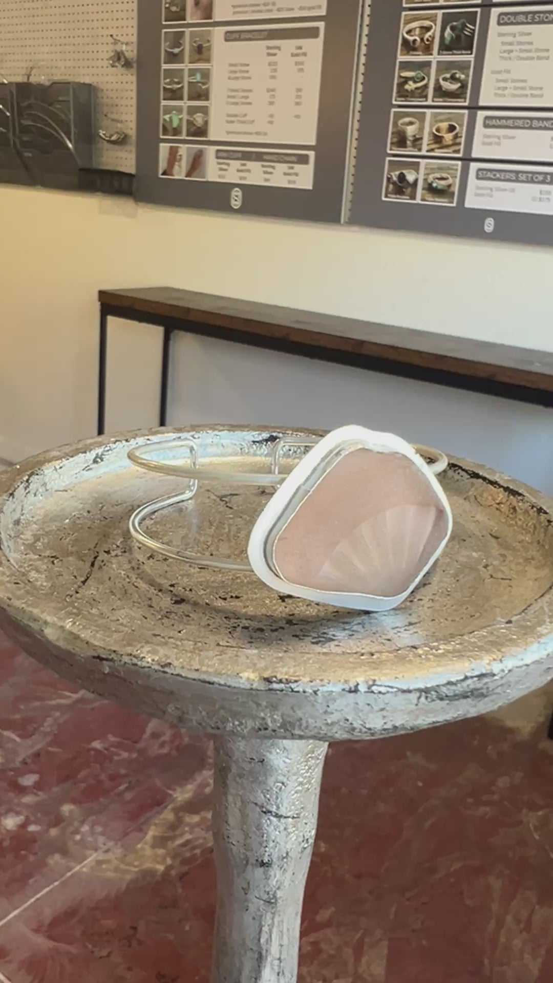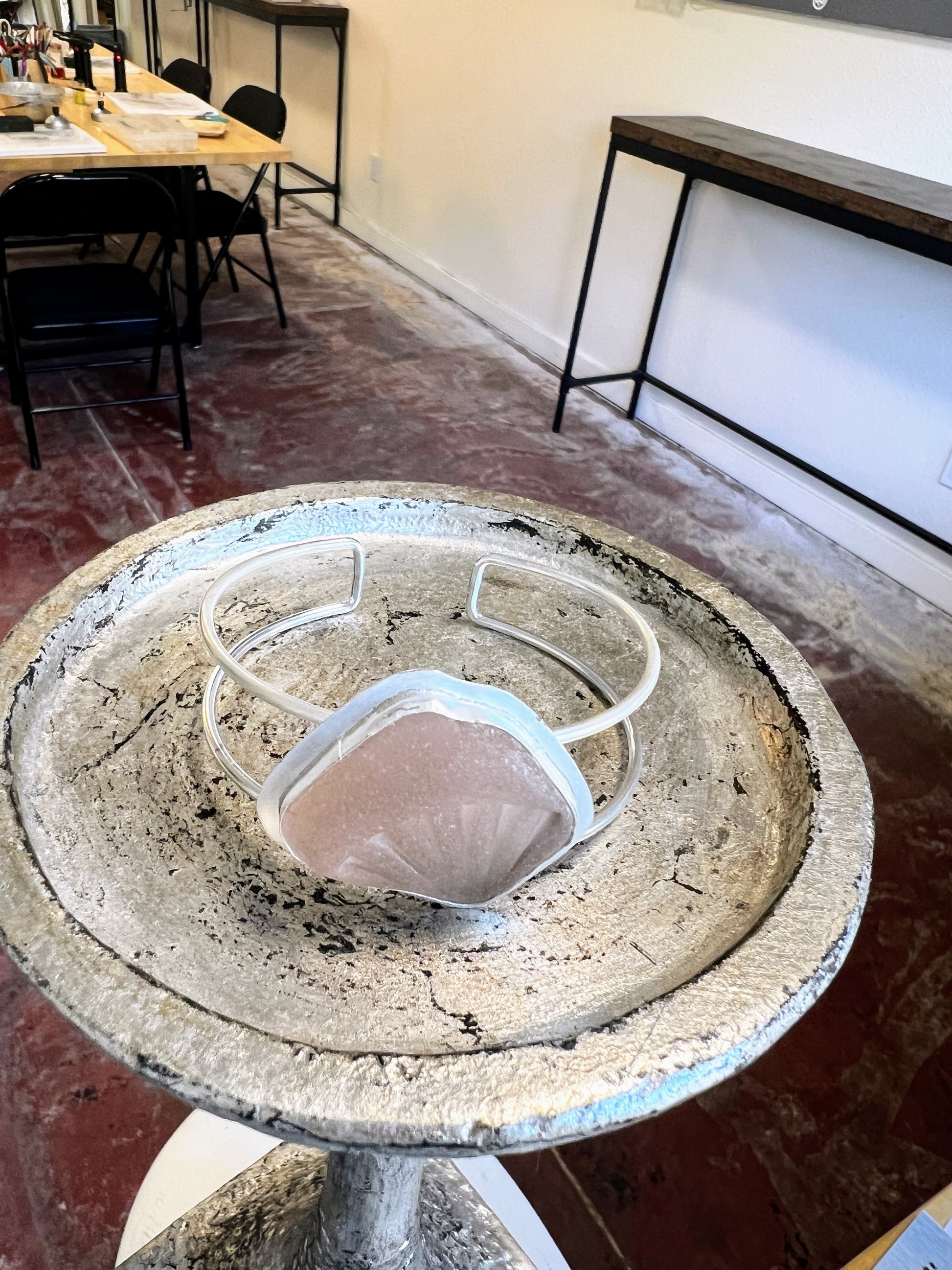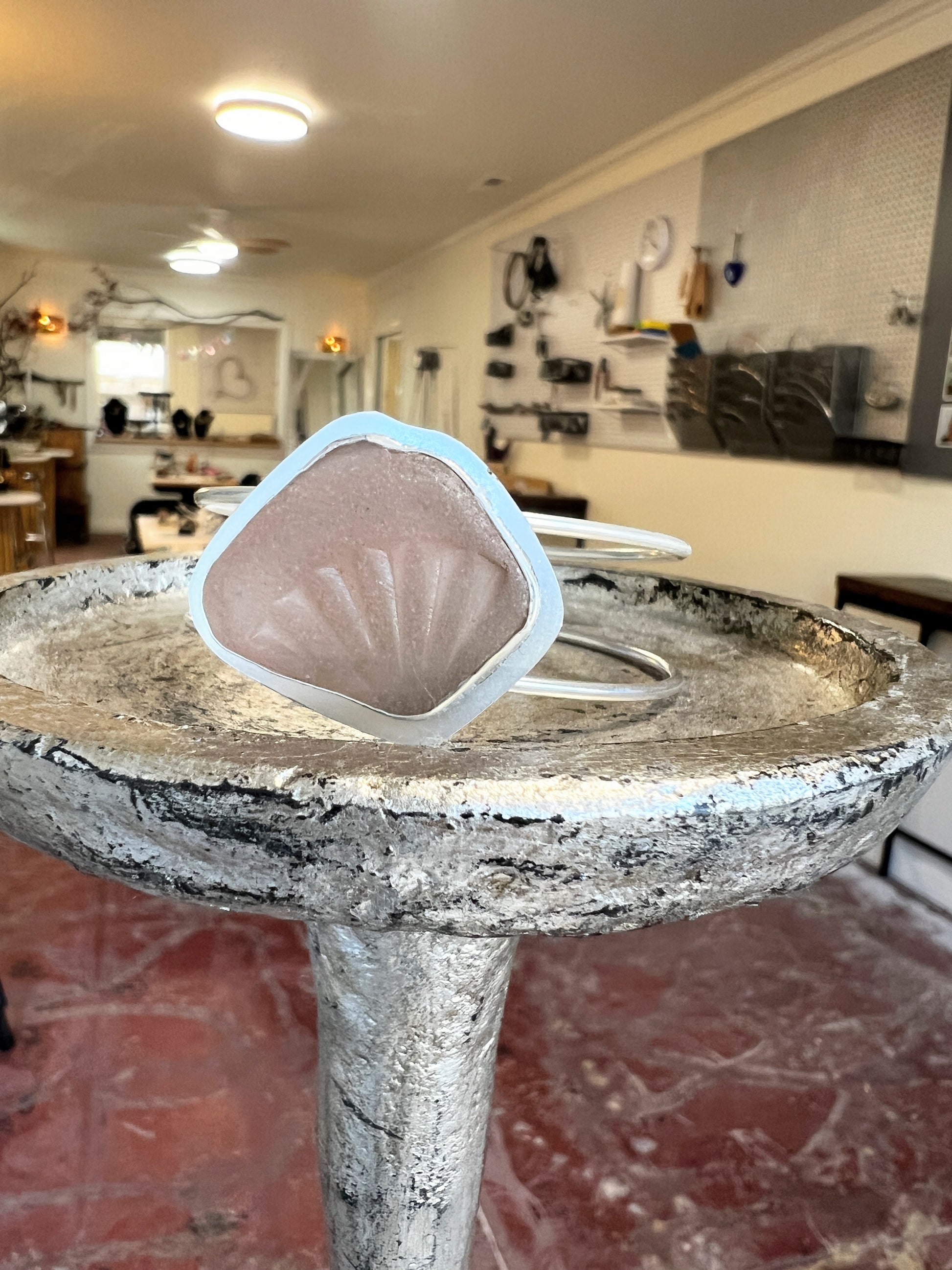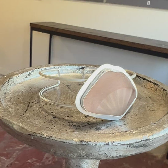 This unique Sea Glass Sterling Silver Cuff Bracelet is handcrafted in our Sausalito studio, showcasing a rare, large piece of patterned pink sea glass set in a custom sterling silver bezel. The double band cuff is adjustable, blending comfort with bold elegance, making it a striking, one-of-a-kind accessory perfect for anyone seeking a statement piece that captures the beauty of the sea.